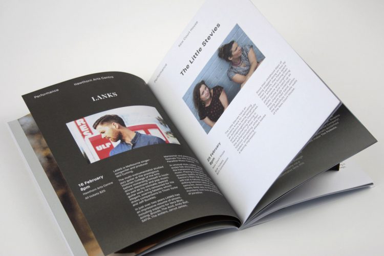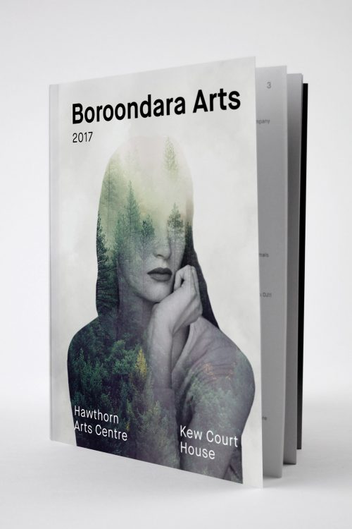 Each year the city of Borrondara runs an extensive arts program through its venues Hawthorn Arts Centre, Kew Court House and the Town Hall Gallery. In previous years each venue has produced its own publication biannually. The challenge for this brief was to produce a publication that brought all the programs into one annual publication under the banner of Boroondara Arts. Whilst exploring themes for the program we discovered the name ‘Boroondara’ is a word in the Woiwurrung language meaning ‘where the ground is thickly shaded’. This translation inspired visual metaphors which could represent the arts program identity for Boroondara. After a number of iterations and with input from all the various stakeholders involved we edited these until the final cover image shown here was selected to represent the year’s program.