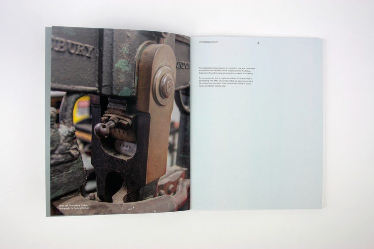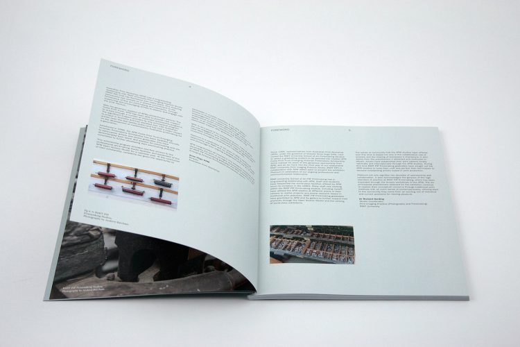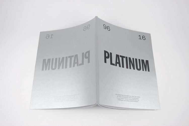 We were comissioned by RMIT to design this publication which accompanies an exhibition celebrating two decades of the Australian Print Workshop Collie Print Trust Emerging Victorian Printmakers Scholarship. The book featured essays and work from the past recipients of the scholarship. 40pp, perfect bound using a metalic silver cover stock appropriately called ‘sirio pearl platinum’ available from Spicers paper.